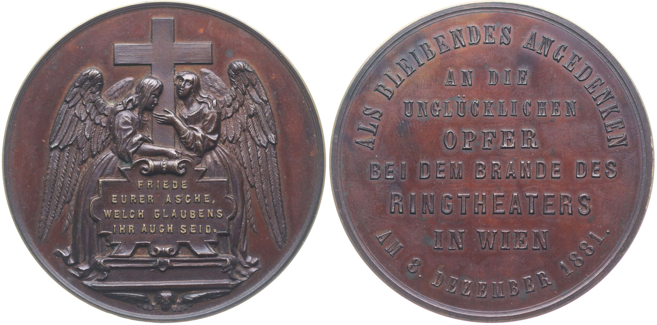 Vídeň - medaile na neštěstí v Ringtheatru v r.1881 Kříž a 4řádk.nápis mězi dvěma anděly / 6řádk.nápis, opis Sign. PRAEGE WILHELM PITTNER WIEN (na hraně)Bronz 56 mm, 67,67 g, Haus.4762, Ung.1213