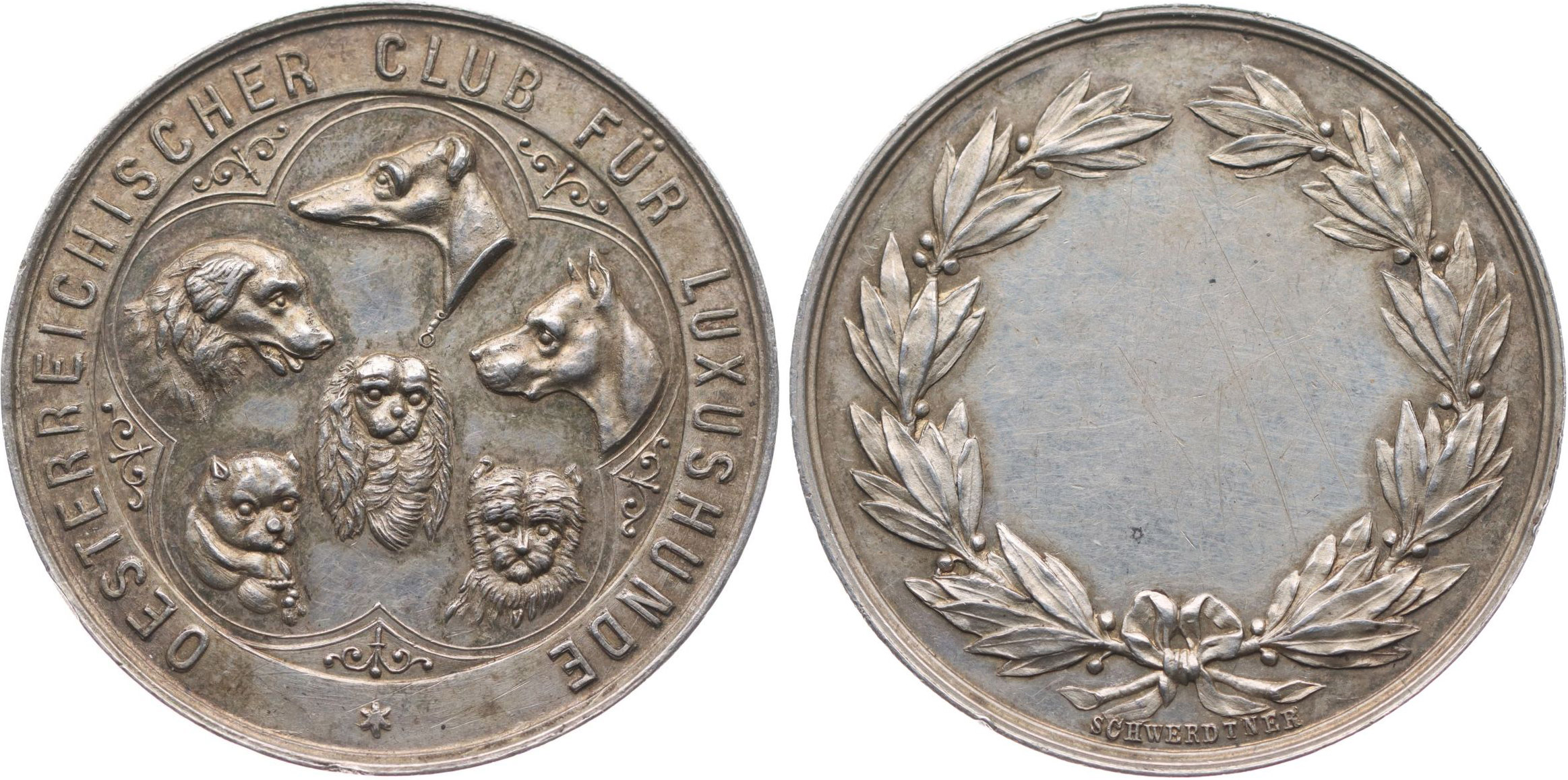 Schwerdtner - rakouský klub pro ušlechtilé psy, b.l. Hlavy šesti psů, opis / po obvodu věnec - s plochou pro věnování Sign., Punc., Ag 36,5 mm, 20,68 g_dr.hr. v rev.