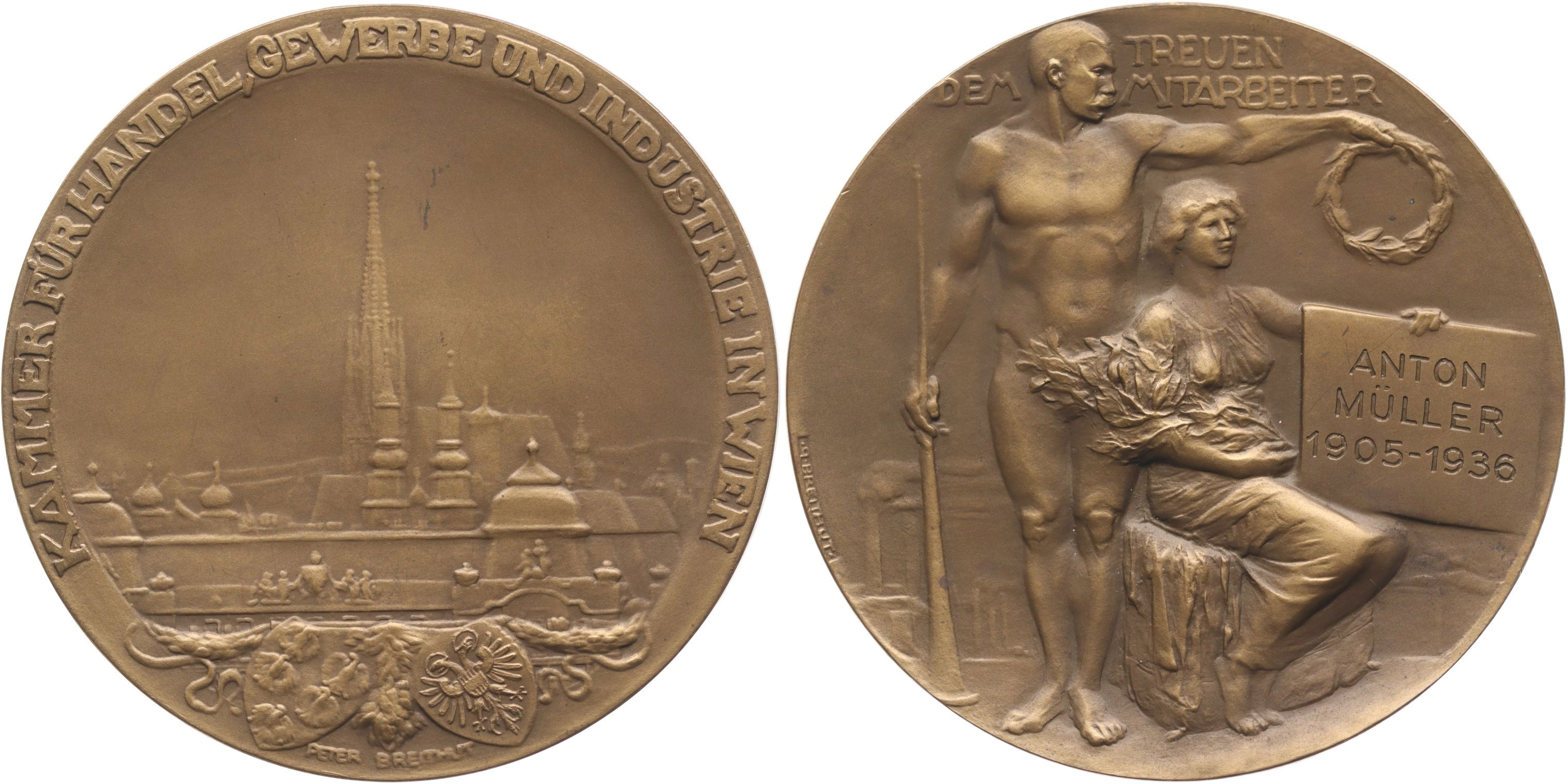 Vídeň - obchodní živnostenská a průmyslová komora ve Vídni 1936 Stojící mužaská a sedící ženská postava s nápisem Anton Müller 1905-1936 / pohled na panorama města, Sign.P.Breithut, Bronz 65 mm