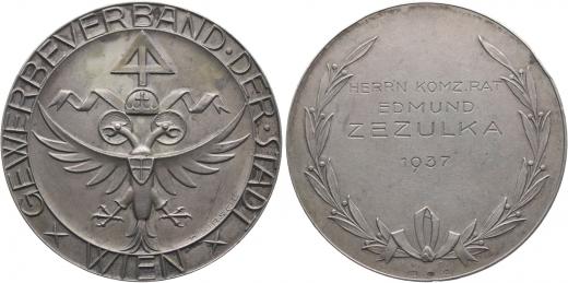 Vídeň - živnostenský spolek města Vídně - věnováno radovi E.Zezulkovi 1934, znak, opis / 3řádk.vyryté věnování ve věnci Sign.H.Kirsch, Punc.900, Ag 60 mm, 76,16 g