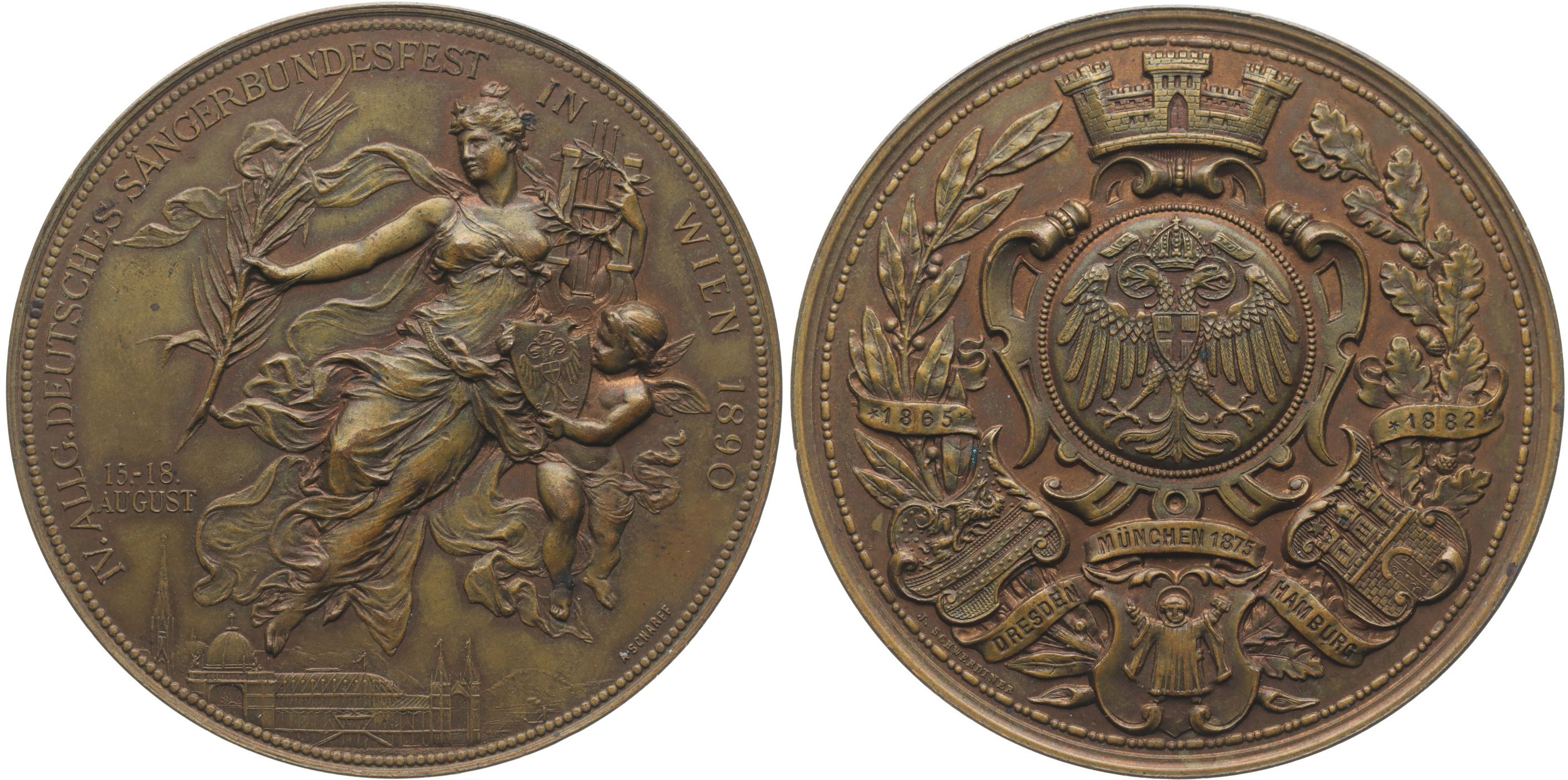 Vídeň (Wien) - IV. setkání německých pěveckých spolků 1890 Alegorická ženská postava s andílkem a ratolestí, lyra, opis / korunovaný rakouský znak v kartuši, ve věnci 3 znakySign.A.Scharff, Bronz 60 mm