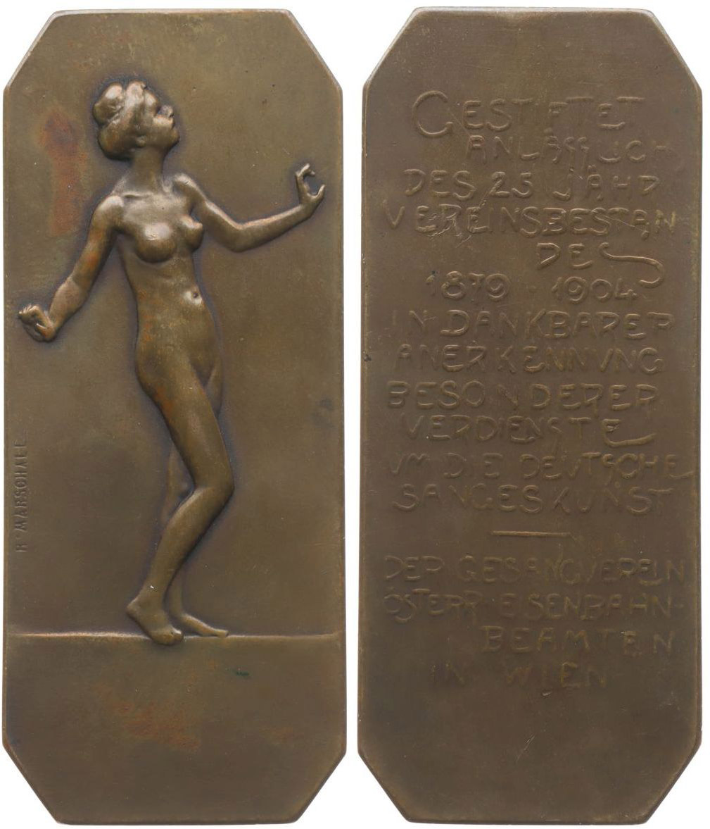 Vídeň (Wien) - 25.výr.pěveckého spolku ve Vídni 1879 - 1904 Stojící akt dívky / 16řádk.něm.nápis, sign.R.Marschall Bronz.plaketa 30x75 mm, 46,13 g