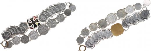 Řetízek ke kapesním hodinkám s přívěskem: 20 Kop. - 1x, 15 Kop. - 2x, 10 Kop. - 17x, 5 Kop. 3x + smalt.tlapatý kříž 1914-1916 s vlajkami zemí trojspolku_vše Ag 53 g celk.24 ks