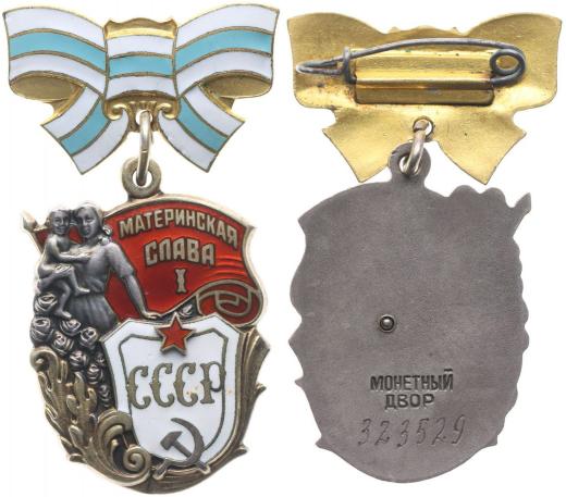 Řád mateřské slávy - I.třída, čísl.: 323529, Ag nepunc., znač.Monětnyj dvor (1944), s připán.závěsem - odznak typu 4, závěs var.B, smalty na odznaku i závěsu, Barac.1038, Herf.2.12.1