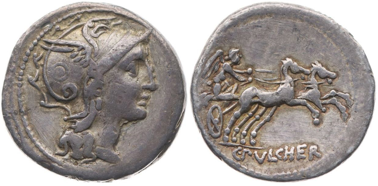 AR Denár, Hlava Romy zprava / Viktorie v bize, nápis "C.PVLCHER.", S.192, Crawford.300/1, Al.1091, Ves.1099