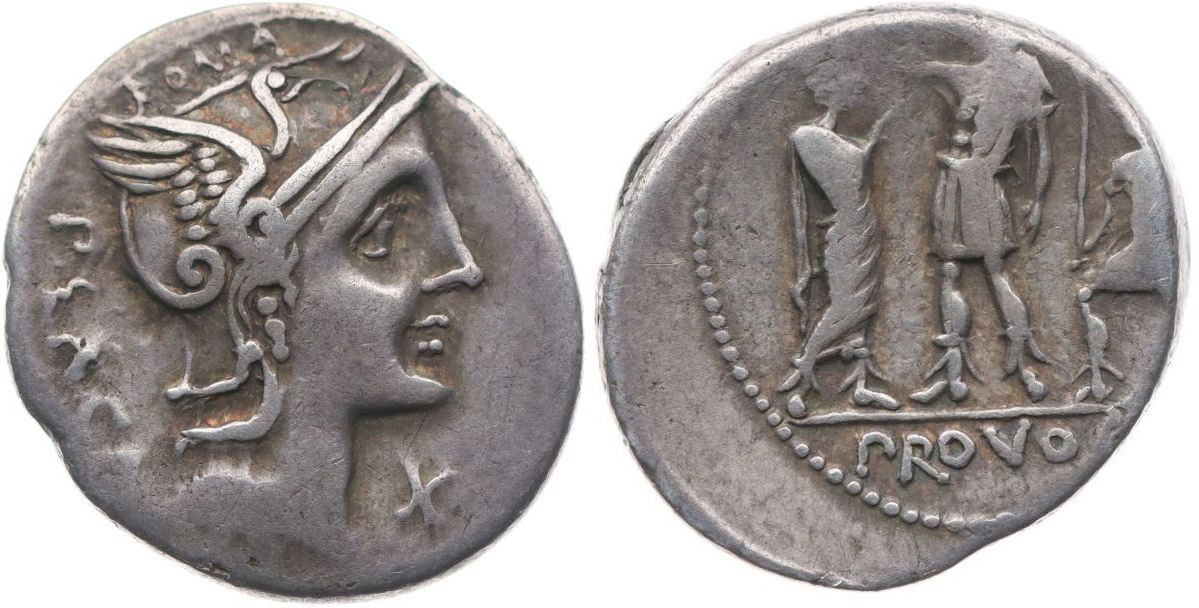 AR denár, Hlava Romy v přilbě zprava / voják dává ruku Togatovi na hlavu, nápis "PROVOCO", Crawford.301/1, S.178, Al.1092, Ves.1100