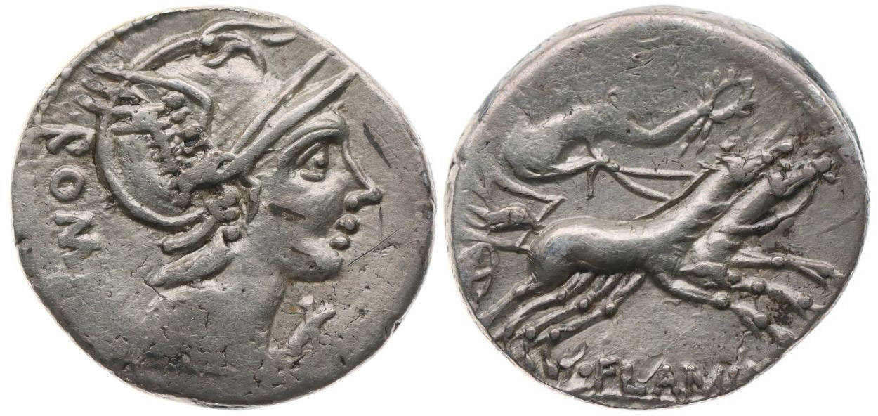 AR denár, Roma s přilbou zprava / Victoria na bize zprava, nápis "L.FLAMINI CILO", Crawford.302/1, S.179, Al.1093, Ves.1101