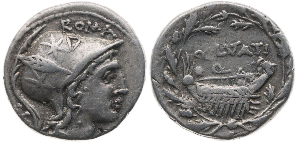AR denár, Hlava Romy v přilbě / galéra ve věnci zprava Q.LVTATI.Q., Crawford.305/1, S.182, Al.1096, Ves.1104