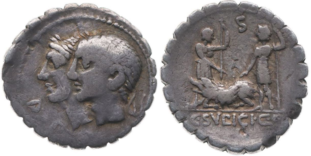 AR Denár - serratus, hlavy Dioskurů zleva / dva vojáci přísahají svými meči, nápis "C.SVLPICI C F.", Crawford.312/1, S.189, Al.1106, Ves.1111