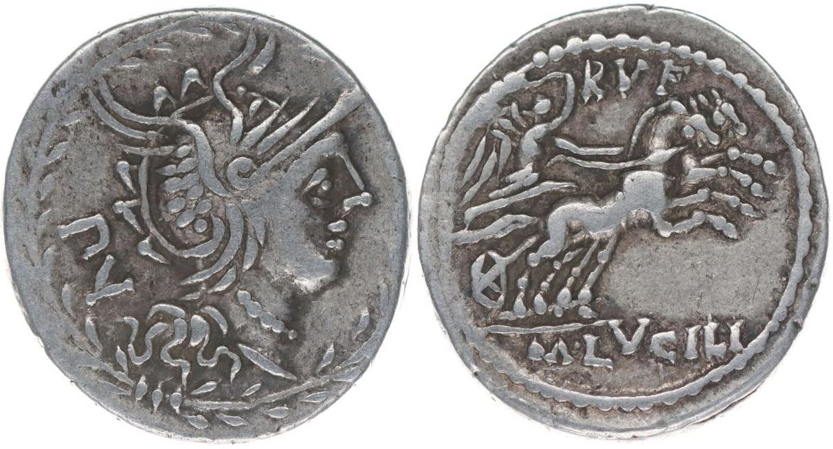 AR denár, Hlava Romy doprava, monogram"PV" / Victoria v bize zprava, nápis "M.LVCILI.", Crawford.324/1, S.202, Al.1129 Ves.1124