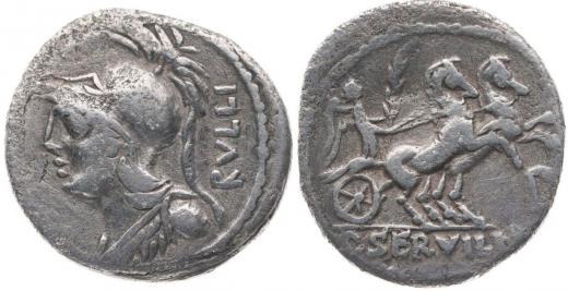 AR denár, hlava Saturna zprava, nápis "PISO CAEPIO Q" / dvě postavy se dí na stoličce, nápis "AD.FRV.EMV / EX.S.C." Crawford.330/1, S.210, Al.1138, Ves.1131
