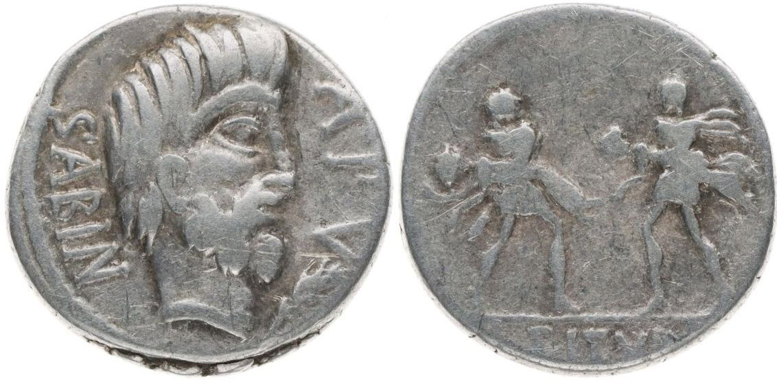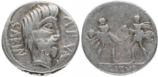 AR denár, Hlava Tatia zprava, nápis"SABIN" / dva vojáci unáší Sabinky, nápis"TITVRI", Crawford.344/1a, S.249, Al.1198, Ves.1152