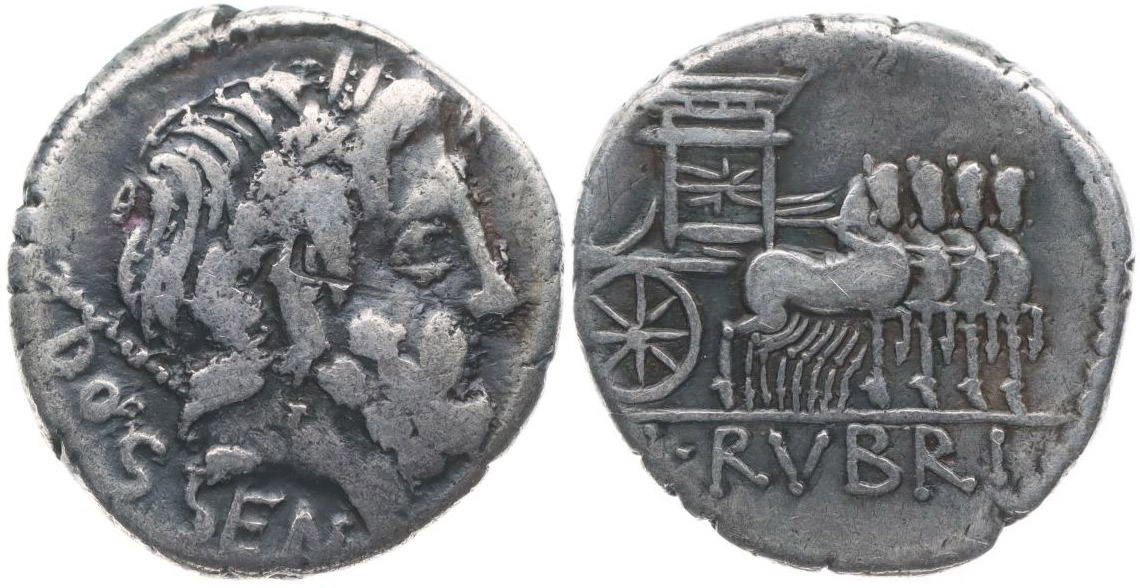 AR denár, hlava Jupitera zprava, nápis "DOSSEN" / triumfální quadriga s Victorií zprava, nápis"L LVBRI", Crawford.348/1, S.258, Al.1214, Ves.1158