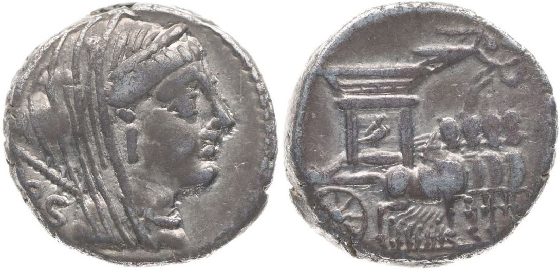 AR denár, hlava Juna s diadémem zprava, nápis "DOS" / triumfální quadriga s Victorií zprava, nápis"L LVBRI", Crawford.348/2, S.259, Al.1215, Ves.1159