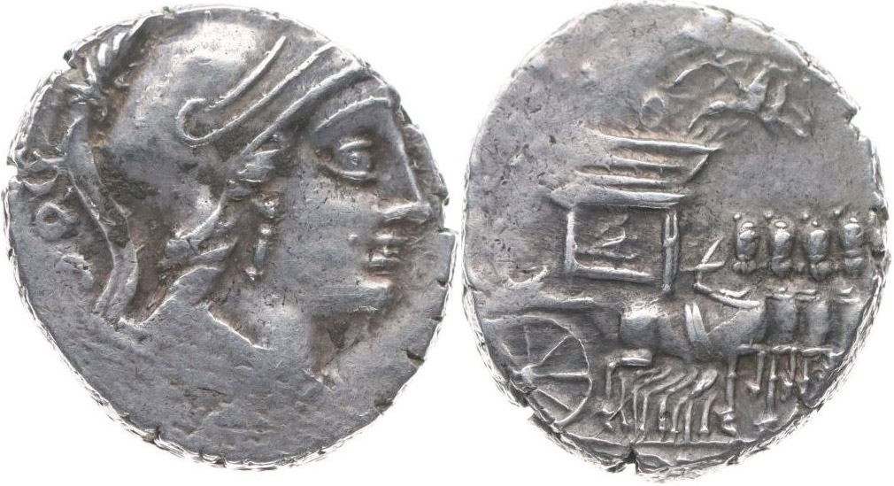 AR denár, hlava Minervy v přilbě zprava, nápis "DOS" / triumfální quadriga s Victorií zprava, nápis"L LVBRI", Crawford.348/3, S.260, Al.1216, Ves.1160_dr.ned. při okraji