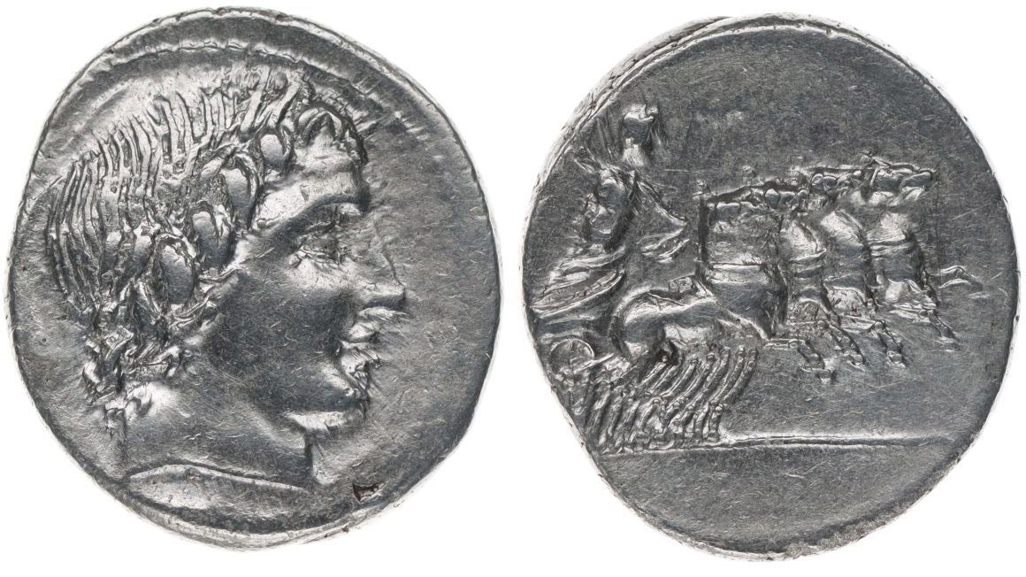 AR Denár, hlava Vejovis zprava / Jupiter s bleskem v bize zprava Crawford.350A/2, S.266, Al.1223, Ves.1162