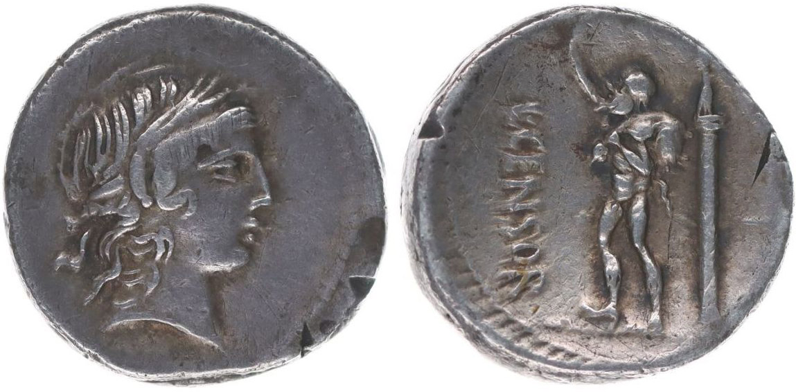 AR denár, hlava Apollóna zprava / Marsyas opřený o sloup s Victorií, nápis "L.CENSOR", Crawford.363/1d, S.234, Al.1254, Ves.1177