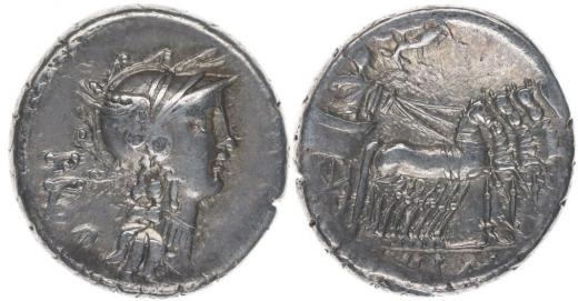 AR denár, hlava Romy zprava, nápis "ANLI PROQ." / Triumfator v quadrize zprava, nápis "L SVLLA IMPE", Crawford.367/1, S.286, Al.1256, Ves.1184