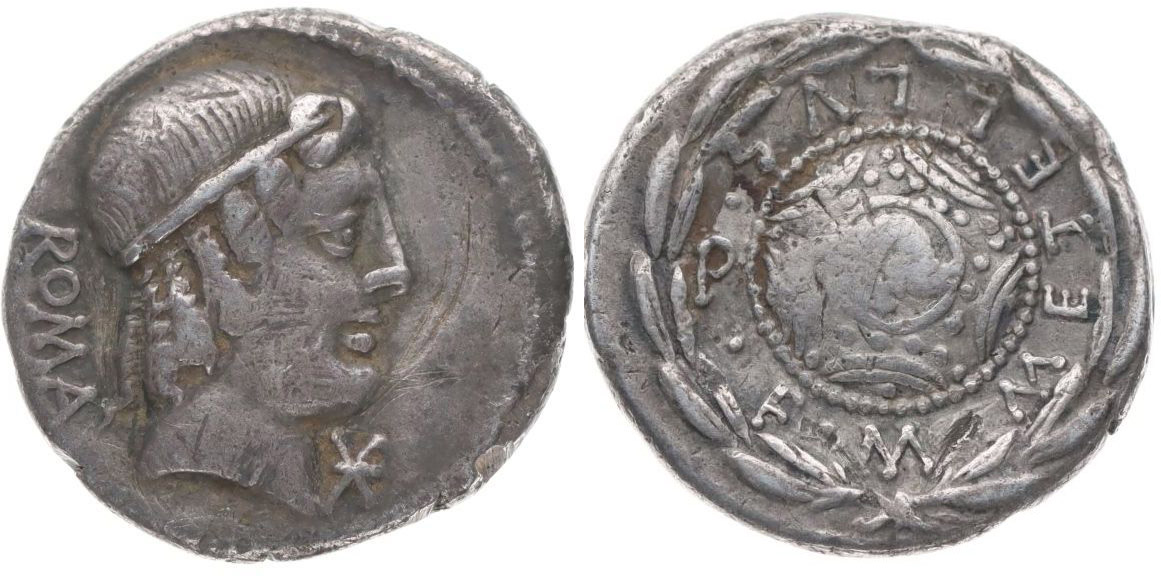 AR denár, hlava Apollóna zprava, nápis "ROMA" / makedonský štít nápis "M METELLVS G F.", Cr.369/1, S.293, Al.1262, Ves.1187