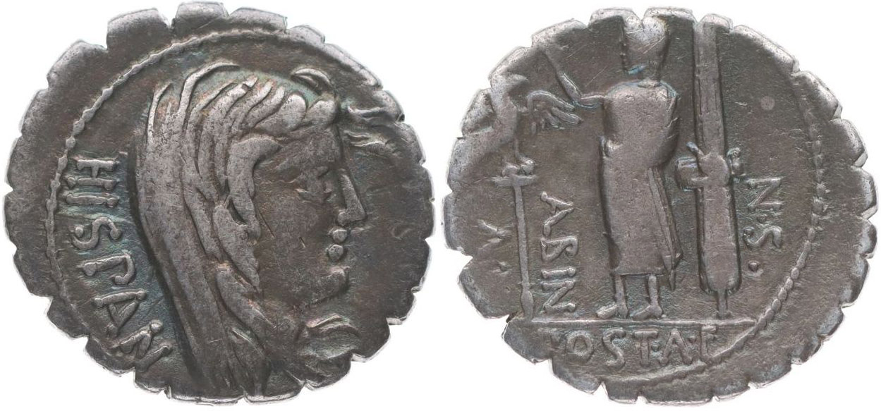 AR denár - serratus, hlava Hispanie zprava, nápis "HISPAN." / stojící s legionářským orlem a svazkem prutů, nápis "A POST A F S N ALBIN." Crawford.372/2, S.297, Al.1264, Ves.1191
