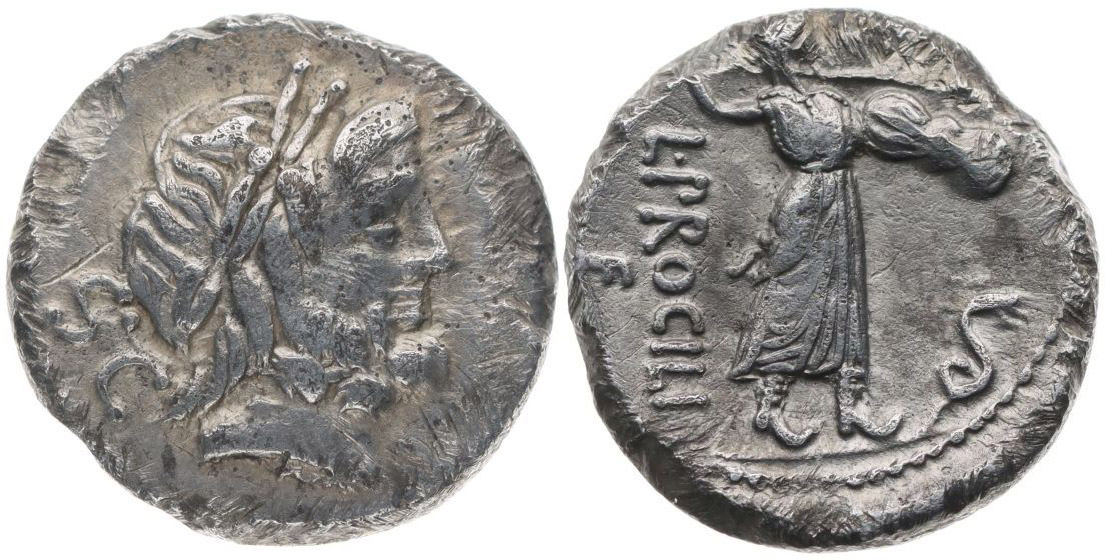 AR denár, hlava Jupitera zprava / Stojící Juno s kopím a štítem, had, nápis "L PROCILI F.", Crawford.379/1, S.306 Al.1273, Ves.1198