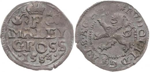 Malý groš 1584, K.Hora-Šatný, HN.3 (opis 7b), J.7c _tečka nad lvem