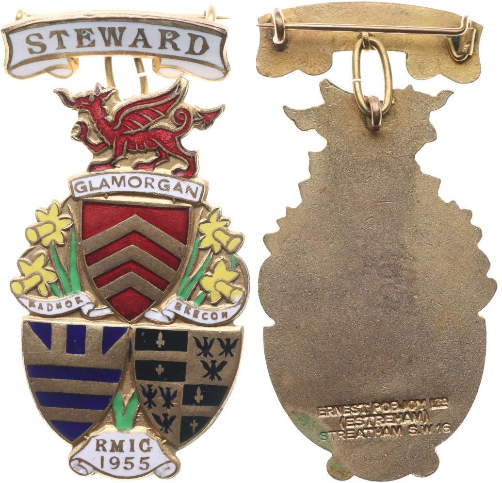 Zednářská medaile "Glamorgan - RMIOC 1955" Tři erby pod drakem, Smaltov. odznak 32x54 mm _závěsná kovová stuha s nápisem "STEWARD" připínací