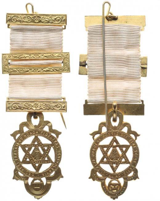 Zednářský medailon - pozlac.bronz 24,5x43 mm Šesticípá trojúhelníková hvězda v kruhu s opisem _dvouráhnová stuha s obdélník.ozdobou s jehlicí