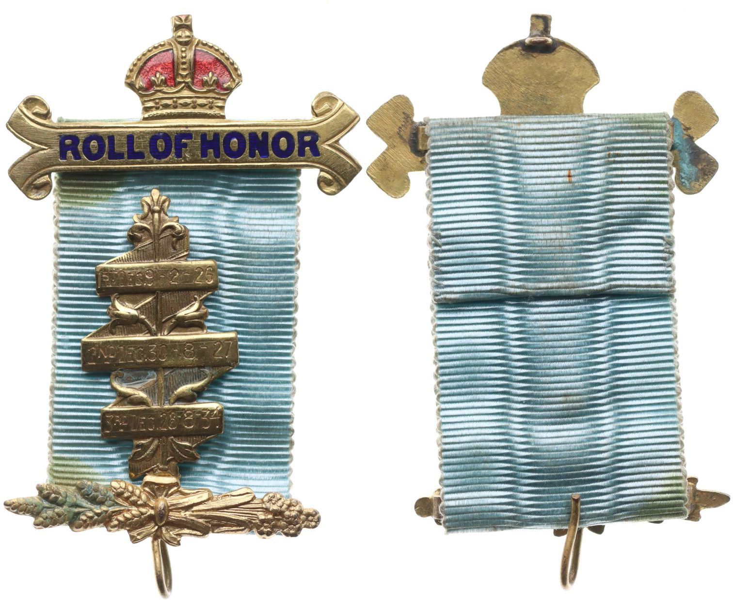 Modrá stuha k zednářské medaili, b.l. Dvouráhnová - horní ráhno čast.smaltov. s ouškem a nápisem "ROLL OF HONOR", spodní ráhno s háčkem