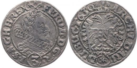 3 Krejcar 1630, Vratislav-Riedel, MKČ.1020pod., Her.1288 zkrácený letopočet, tří cány nad hlavou