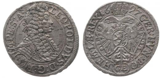 3 Krejcar 1697, Praha-Egerer, Nech.208, MKČ.1425, Ja.11b oválný štít_R!