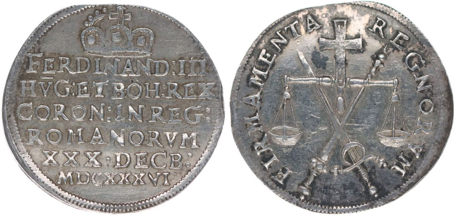 Střední jeton ke korunovaci na římského krále v Řezně, 30.12.1636 Pod korunou 6řádk.nápis / zkřížený meč, žezlo a kříž, na něm zavěšeny váhy, Ag 23 mm, 2.24 g, Nov.VII/E-4b, Mo.801, Ho.1880