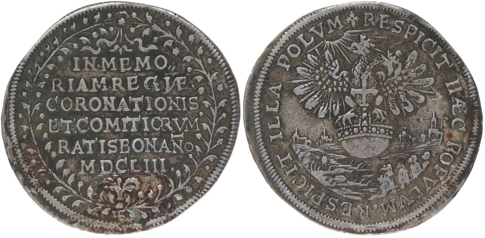 Velký jeton na korunovaci v Regensburgu, 18.VI.1653 Císařský dvouhlavý orel drží říšské jablko nad městem, opis / 6řádk. nápis v ozdobné kartuši, Nesign., Ag 25 mm 2.62 g, Nov.VIII/D-18bMo.851_R!