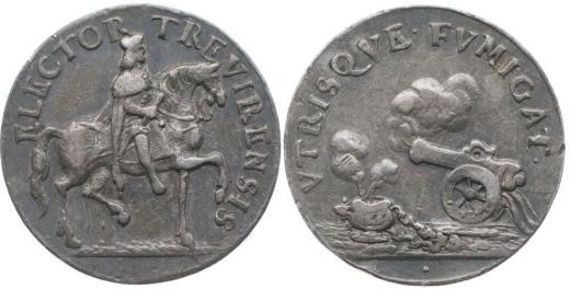 Medaile na římskou korunovaci v Augsburgu, b.l. (1690) Trevírský kurfiřt na koni zprava, opis / dělo a dým, opis Nesign., Ag 17 mm, 2.29 g Nov.X/L-74a, Mo.-, Ho.2433_RR!