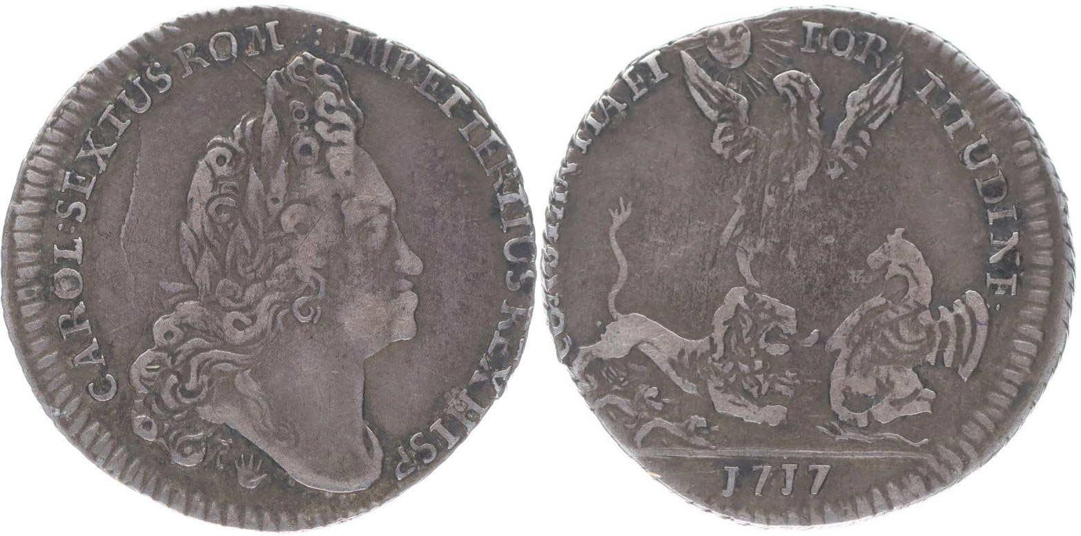 Roettiers - na holdování v rakouském Nizozemí 1717 Portrét zprava, opis / lev a dvě lvíčata bojují s drakem, opis Sign.R., Ag 26 mm, 3,06 g, Nov.XI/T-6a_R!