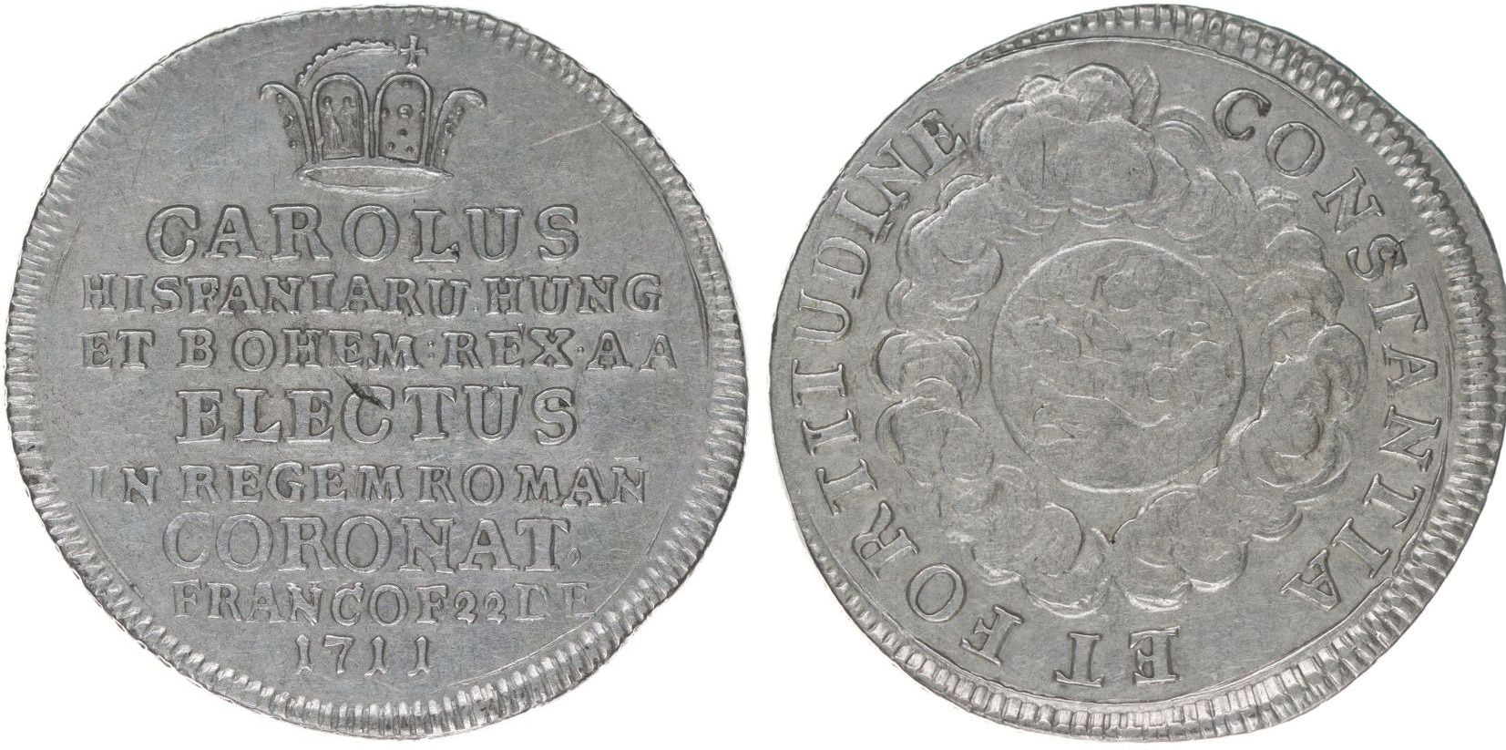 Větší peníz na korunovaci na římského císaře ve Frankfurtu 22.12.1711 Pod korunou 8řádk.nápis / zeměkoule v oblacích, opis, Nesign., Ag 26 mm, 4.82 g, Nov.XI/F-42b, JF.680c_R!