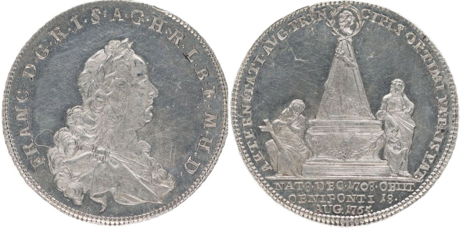 Větší úmrtní peníz, 1765 Poprsí zprava, opis / žena klečící před náhrobkem, postava Spravedlnosti, 3řádk.nápis v úseči, opis, Ag 24 mm, 3,80 g, Mo.1950_R!