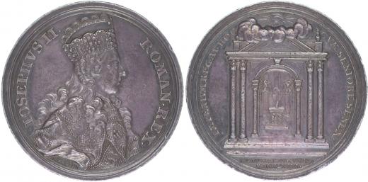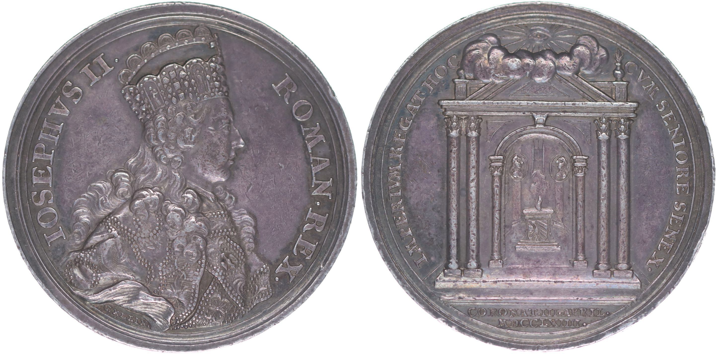 J.L.Oexlein - medaile na korunovaci na římského krále 3.4.1764#Ag Portrét zprava, opis / vchod do chrámu s oltářem, 2řádk.nápis v úseči, opis, Sign., Ag 45 mm, 29,15 g, Nov.XV/C-5a, Ho.3126, Mo.-, LG.XIV/179