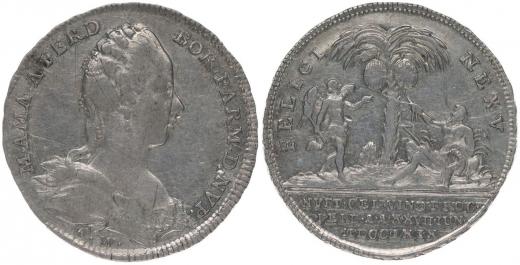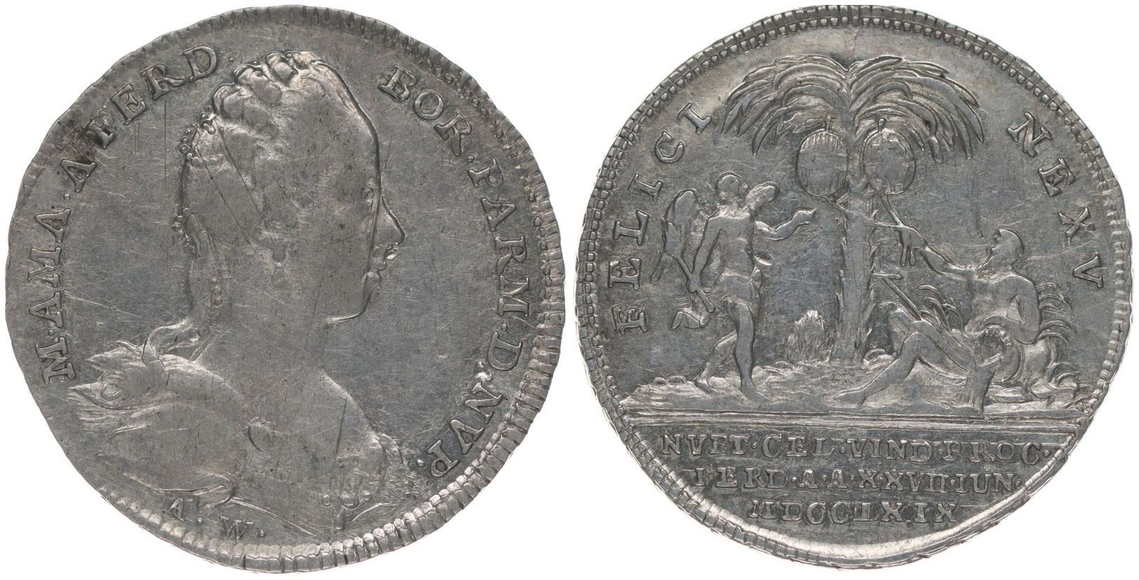 A.Wideman - na zasnoubení s Ferdinandem Bourbonským 27.6.1769, Portrét arcivévodkyně zprava, opis / 2 alegorické postavy pod stromem se znaky, Sign.A.W., Ag 25 mm, 3.86 g, Mo.1999LG.XIV/238, Ho.3304, SD.215