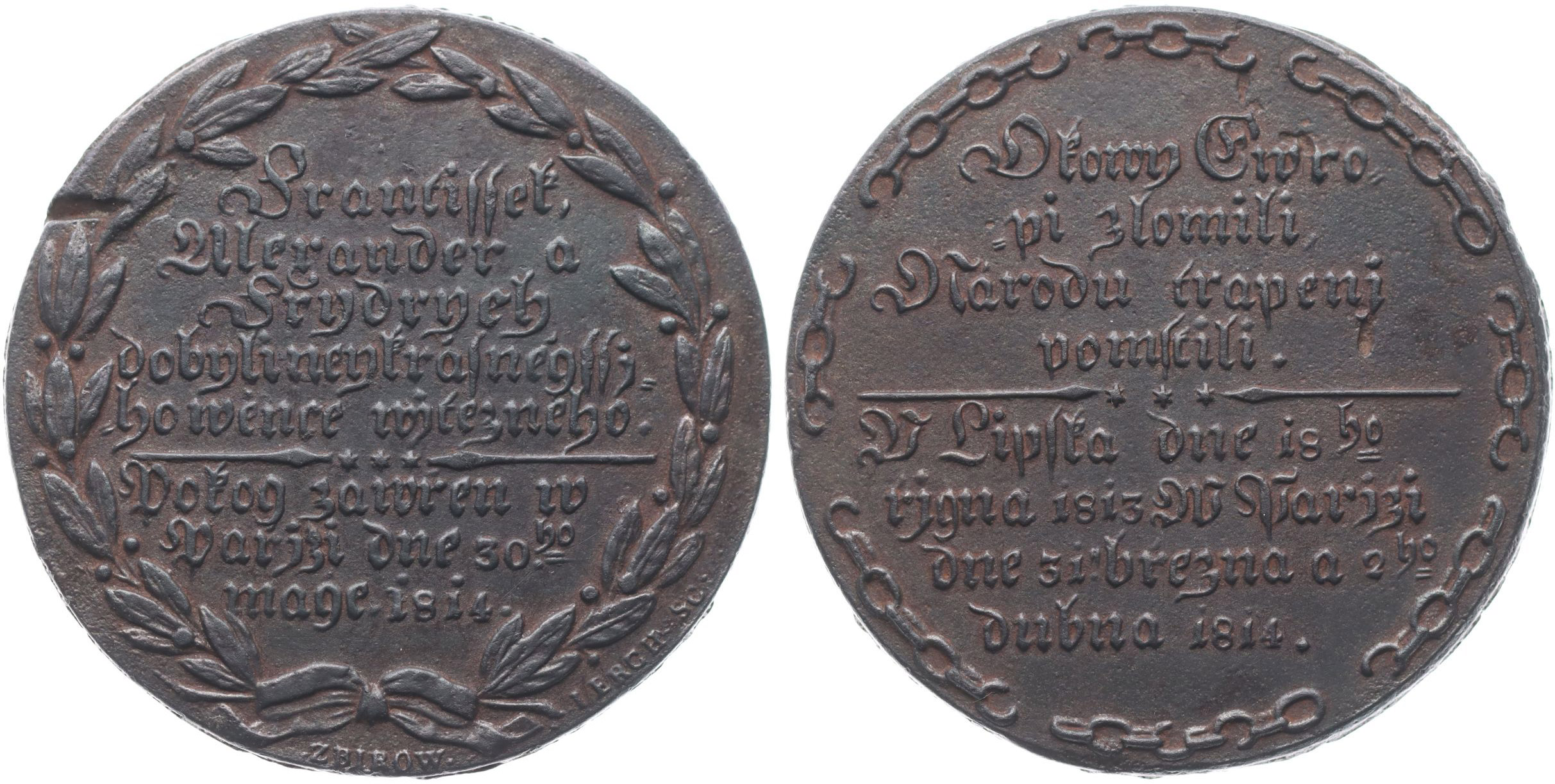 Lerch - pamětní medaile na vítězství spojenců nad Napoleonem 1814 8řádk.něm. text ve věnci / 8 řádk.český text v přerušovaném řetězu železárny Zbirov, Fe 53 mm, MZČ.137/1, ČS.1446