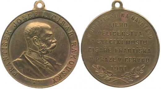 Christlbauer - návštěva v Praze a svěcení mostu, 1901 Poprsí zprava, opis / 6-řádkový český nápis, lipové snítky a opis, Sign., Pozlac.bronz 28 mm_orig.raž.ouško
