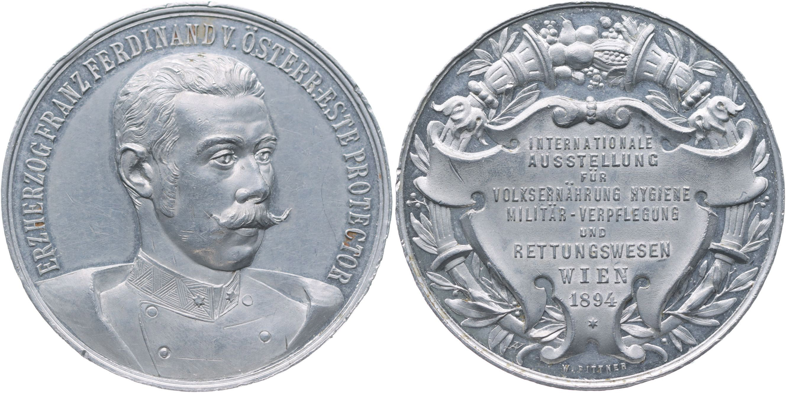 W.Pittner - mezinárodní výstava hygienického stravování 1894 Poprsí čelně mírně zprava, opis / 9řádk.nápis v ozdobné kartuši, po obvodu zdobený věnec,Sign., Al 40 mm, Haus.3023, Wu.2435