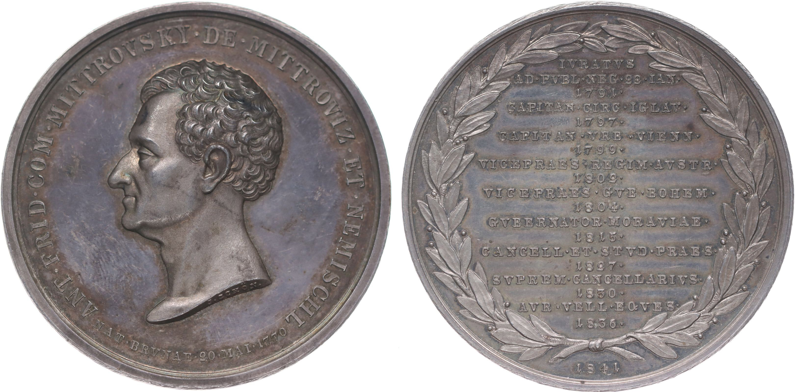 Životopisná medaile, 1841 ( od r.1815 morav.gubarnátor), 1841#Ag Hlava zleva, opis / ve věnci životopisná data, Sign.J.Schön, Nepunc., Ag 50 mm, 43,59 g, Mo.2847, Ho.7485, Do.3606, MZČ.139/5, MN.283