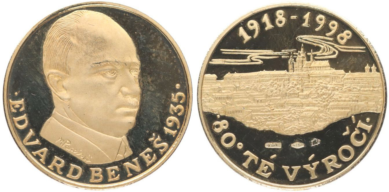 M.Poccini - medaile k 80.výročí obrody českého národa a vzniku republiky 1918-1998, vyd.1999, portrét prezidenta dr.Edvarda Beneše z poloprofilu, opis / panorama Pražského hradu, opis, Sign.,Au 750/1000, 21 mm, 6 g, Nov.02.073, raž.697 ks