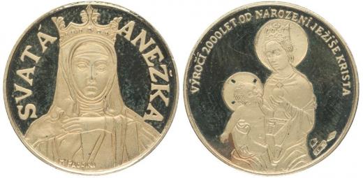 M.Paccini - medaile k výročí 2000 let od narození Ježíše Krista, b.l. Poprsí Svaté Anežky čelně, opis / Madona s dítětem, opis Au 750/1000, 21 mm, 6 g
