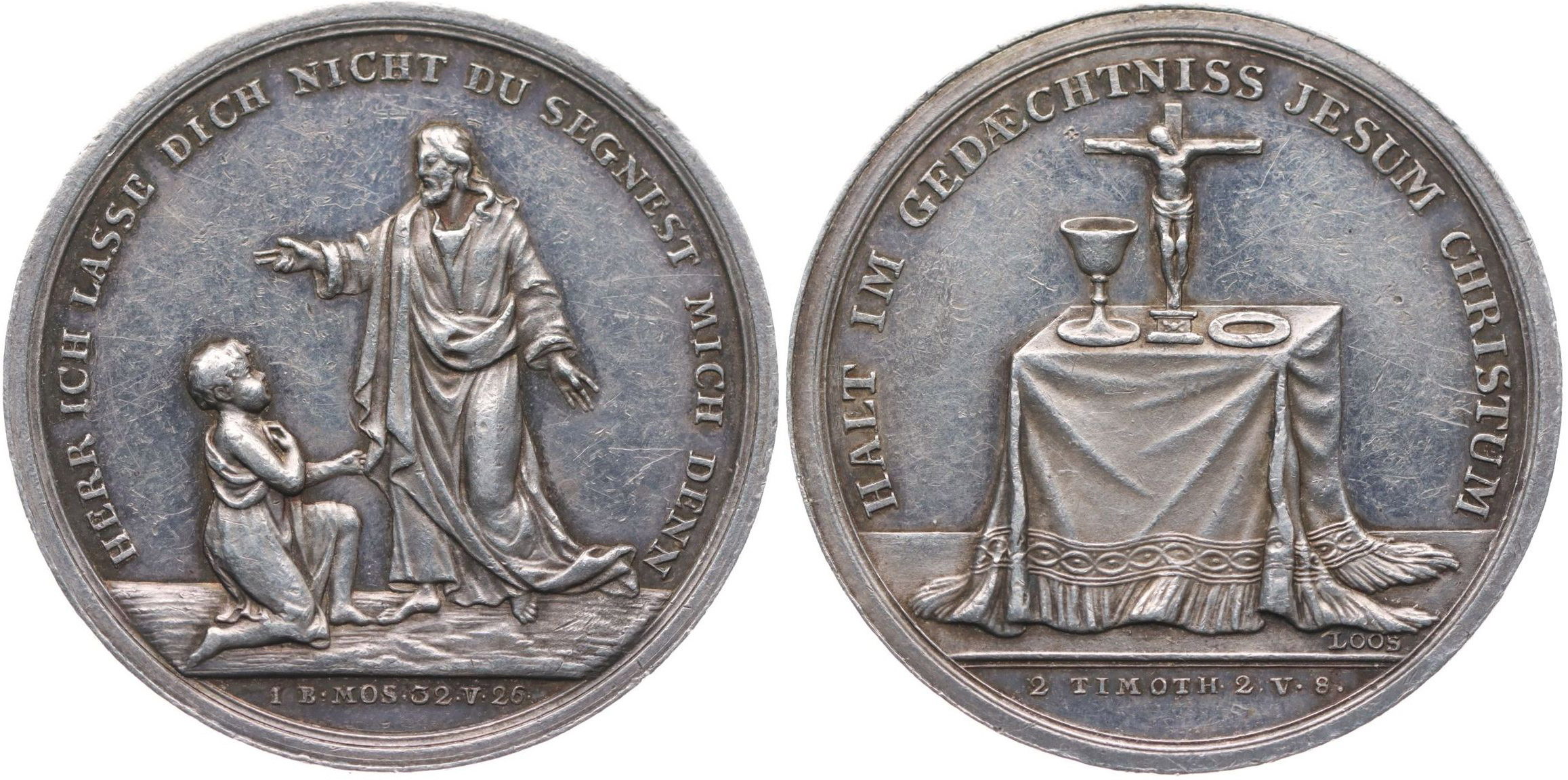 Loos - dítě klečící před mužem, německý opis / na stolku krucifix, pohár a mísa, německý opis, v úseči citát z Bible Ag 36 mm, 12,5 g
