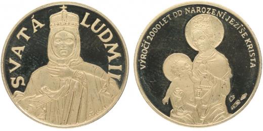 M.Paccini - medaile k výročí 2000 let od narození Ježíše Krista, b.l. Poprsí Svaté Ludmily čelně, opis / Madona s dítětem, opis Au 750/1000, 21 mm, 6 g