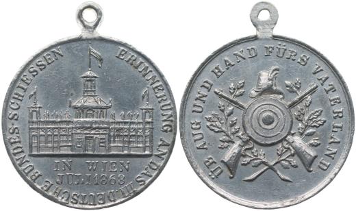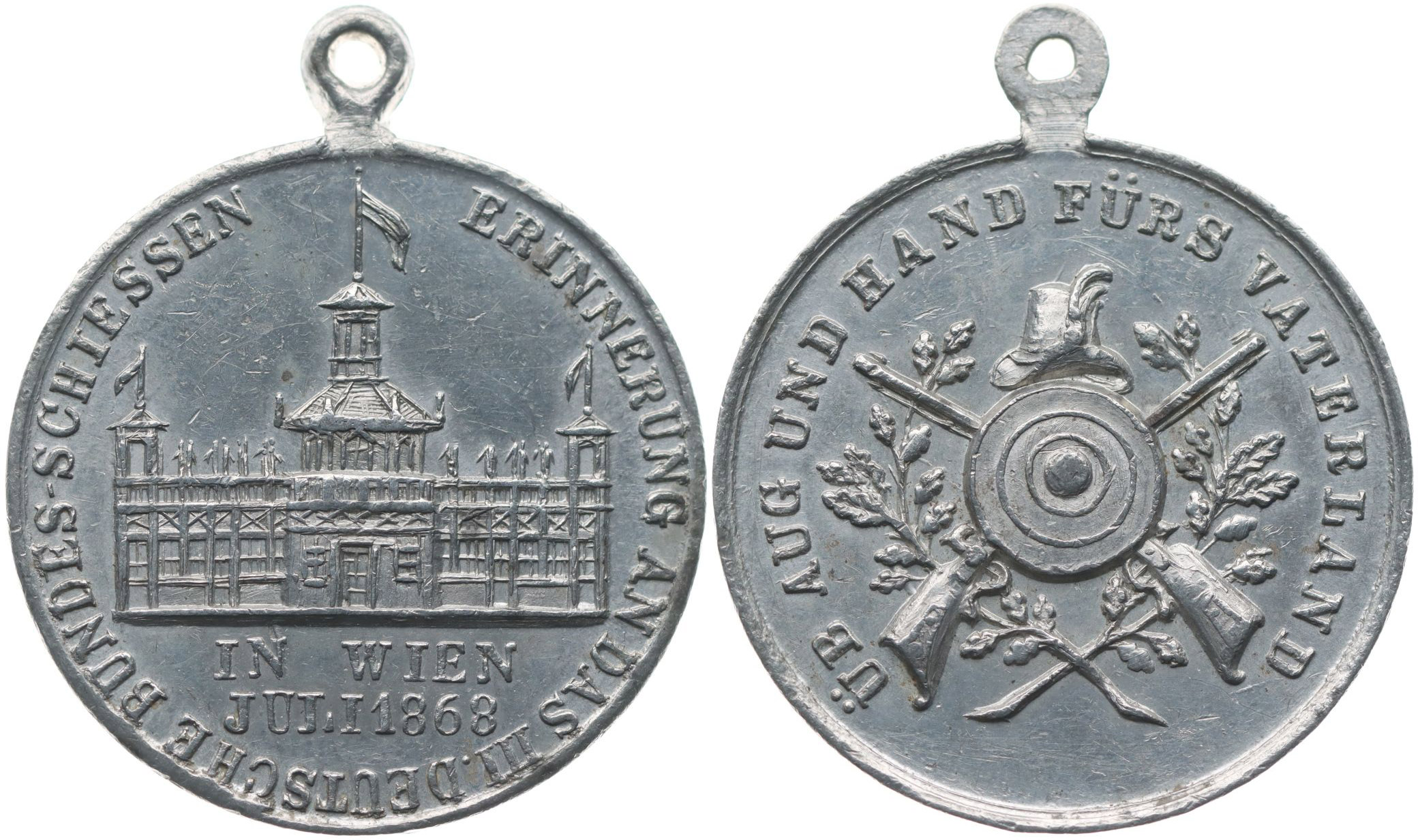 Vídeň - 3.německé spolkové střelby 1.7.1868 Pohled na střelnici, opis / terč se zkříženými puškami, opis Nesign., Sn 33 mm_orig.raž.ouško