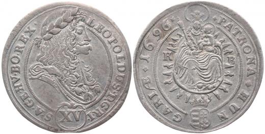 XV Krejcar 1696 KB, Nech.1184, Höl.96.1.3 v opisu rev. tečka za PATRONA
