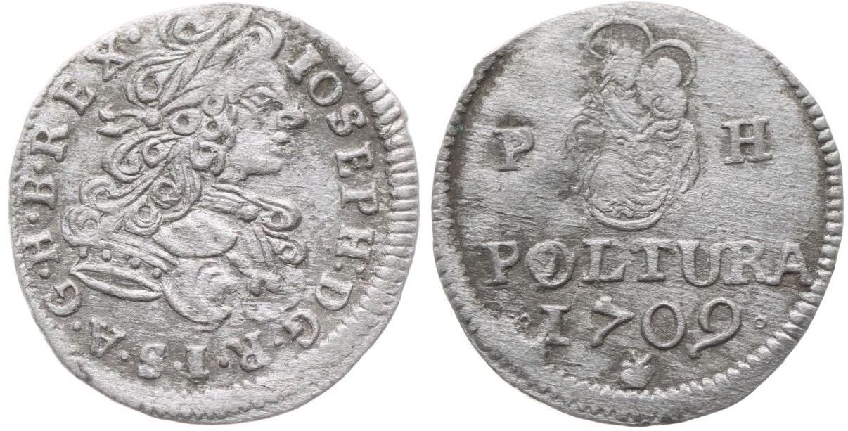 Poltura 1709 P-H, Kremnice, Hal.456, Hu.1579, Her.276 var.v portrétu, tečky před a za letopočtem
